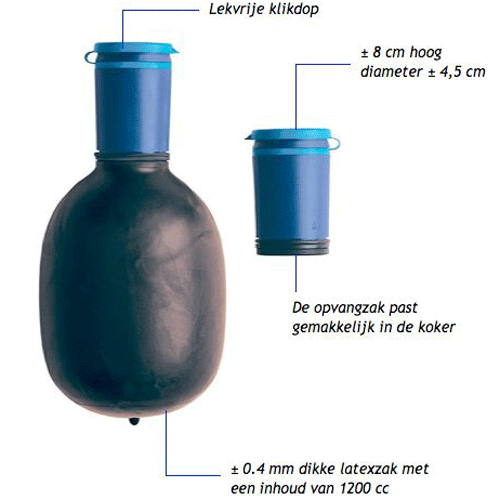 - De opvangzak is gemaakt van latex, een volledig natuurlijk product en kan hierdoor op den duur slijtage vertonen.